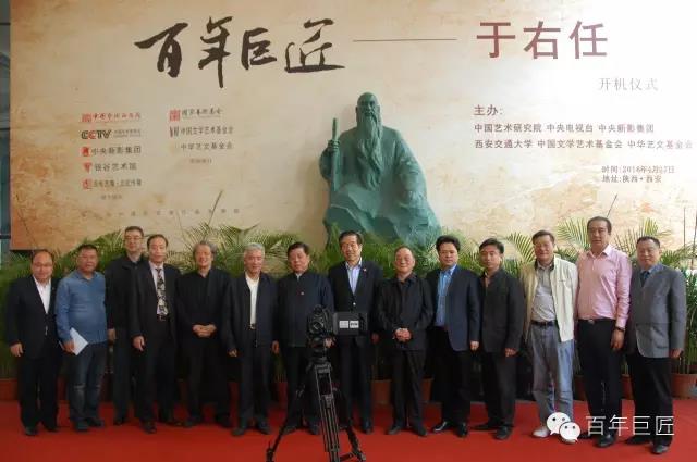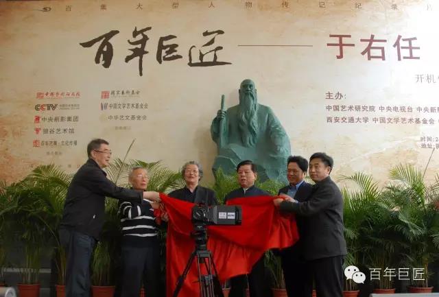 ▲ 2016年4月27日,百集大型系列人物传记纪录片《百年巨匠——于右任》开机仪式在西安交通大学举行。全国政协委员、中国书法家协会理事、中国人民革命军事博物馆研究馆员卢中南,全国政协书画室副主任赵学敏,中国书法家协会顾问、西安交通大学博物馆馆长钟明善,全国政协常委、中国文联原党组书记、中国文学艺术基金会理事长胡振民,陕西省委宣传部副部长陈彦,《百年巨匠》出品人、总策划杨京岛为开机揭幕。