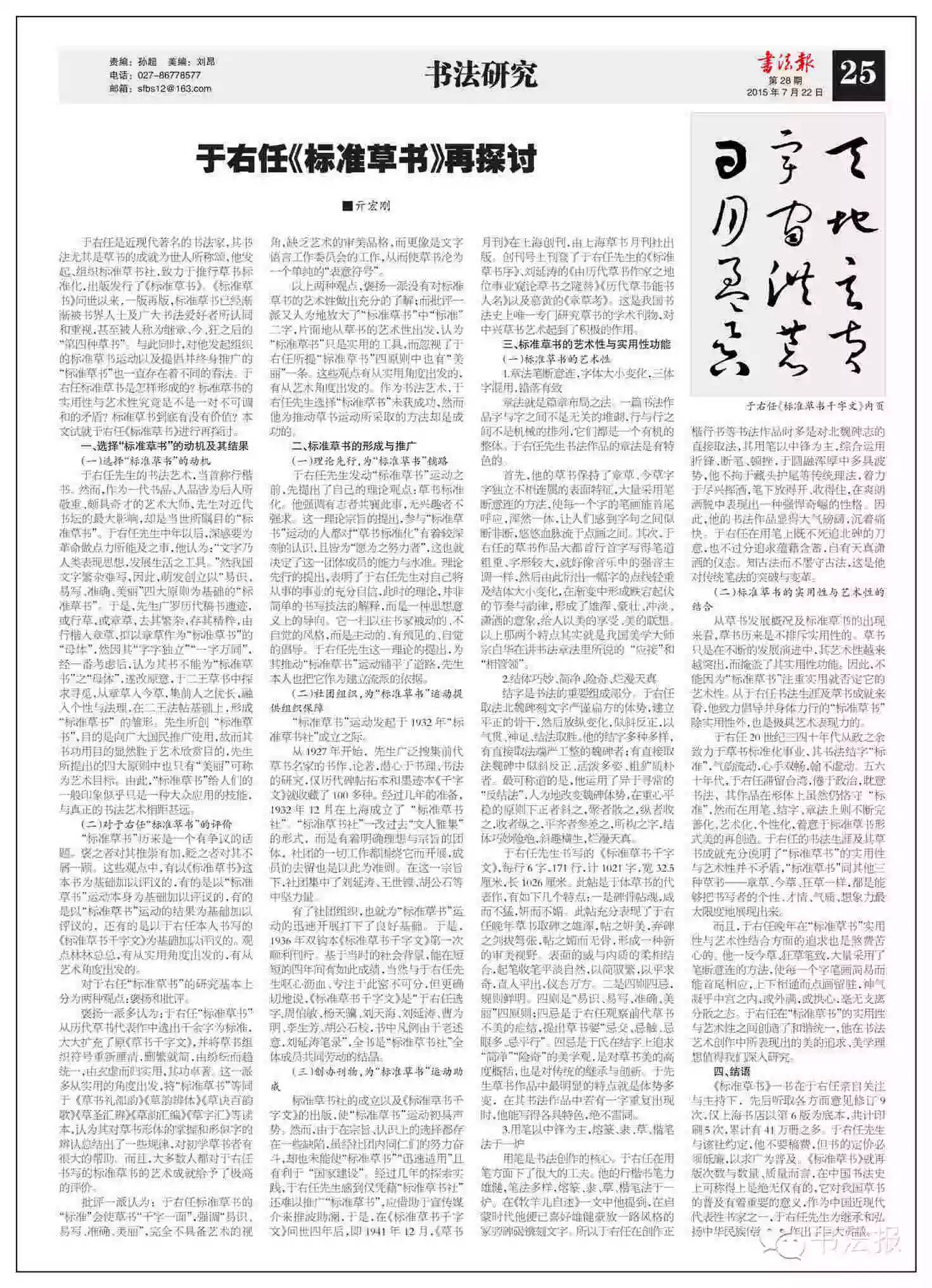 从草书发展概况及标准草书的出现来看,草书历来是不排斥实用性的。草书只是在不断的发展演进中,其艺术性越来越突出,而掩盖了其实用性功能。因此,不能因为“标准草书”注重实用就否定它的艺术性。从于右任书法生涯及草书成就来看,他致力倡导并身体力行的“标准草书”除实用性外,也是极具艺术表现力的。