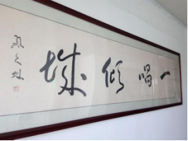 走进戴久林先生书法创作室,浓郁的书香气息扑面而来,无论是中堂、长幅还是扇面,都体现着他对书法的热情和追求;他遵循于右任先生确立的标准草书“易识、易写、准确、美丽”四标准,既注重传统的继承,又广泛汲取众多名家之长;每幅作品都笔法纯熟、浑然一体、个性鲜明,既有二王之精妙,又深得于、胡之神韵,奔放沉稳而又法度严谨。他的标准草书作品,无声地渲染着一种成熟豪放的个性、一种在坚实功底上创新的探索和收获。2010年9月,出版了《戴久林书法作品集》,同年在中国书法城乌海市举办“戴久林书法作品展”,获得书法名家和书法爱好者的一致好评。2015年纪念于右任先生诞辰135周年暨于门一脉国际书法展,在台湾展览现场写下的草书“书道千秋”作品。台湾有关媒体纷纷竞相发表。