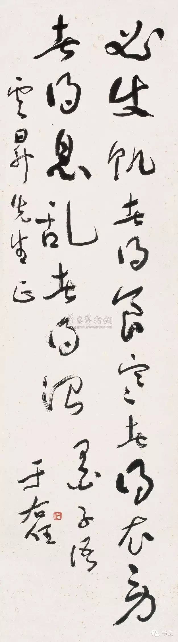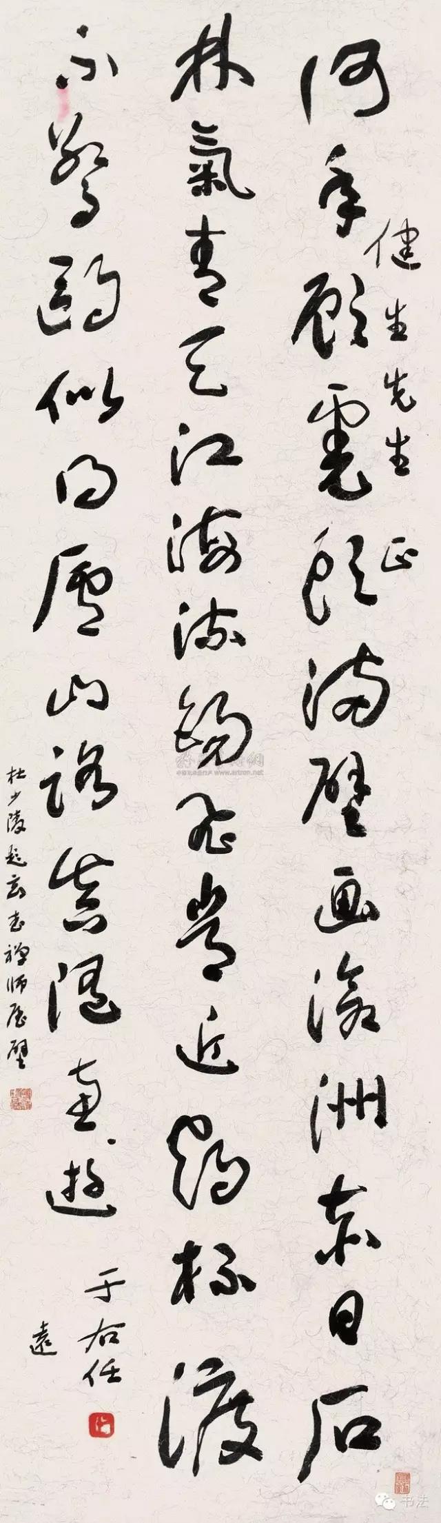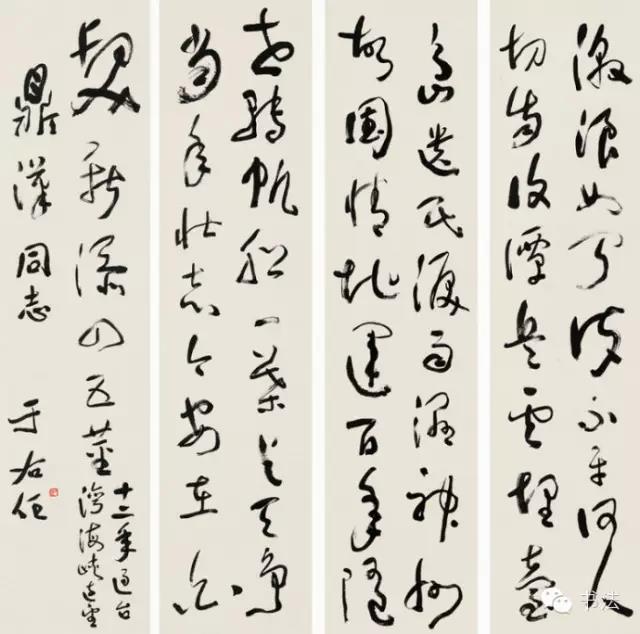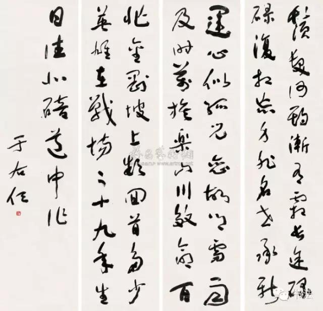 台湾有人评论于右任的字说:“有的沉静如处子,有的飞腾如蛟龙,有的勇猛如武士,有的圆美如珠玉,有的苍劲如奇峰,有的柔回如漪波,有的憨态逗人迷,有的痴态使人醉,有的跃跃欲起飞,有的如瀑布直流,有的如野马狂奔,有的如古树悬空……每一个字,莫不神话。”于右任把写字当作一种运动,一种乐趣。他自己曾说:“写字时有一种说不出的乐趣。我觉得每个字都有它的神妙之处,但是,这种神妙,只有在写草书时才有,若是写其它字体,便失去了那种豪迈奔放的逸趣。”
