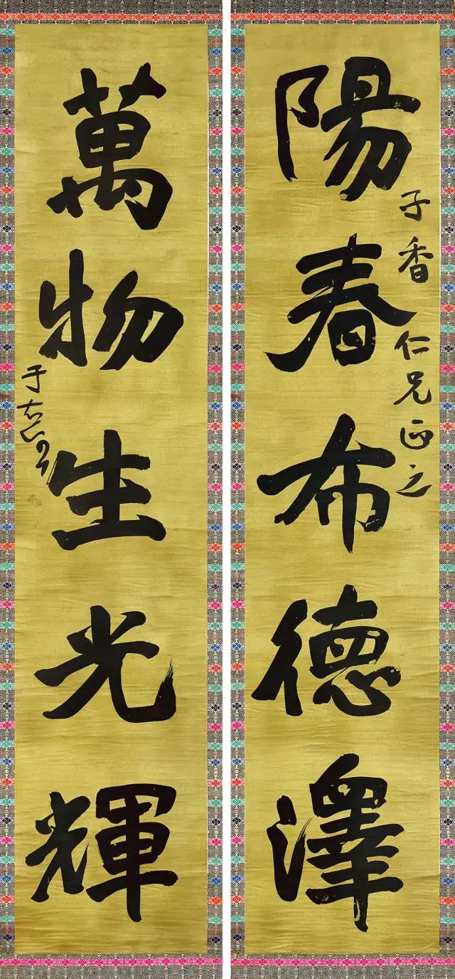 于右任的泥金笺对联非常稀少,此幅五言联可以说是迄今为止亮相的最气势宏伟的一幅!更为难得的是魏碑大字,笔划严谨,魄力雄健,气象浑穆非全神贯注不能得。故魏碑大字、富丽金笺、雄浑五言都展现了于右任对于马步芳的重视,这在于右任的作品中是非常罕见的。这幅作品后来流寓日本,经过重新装裱,并配有原木盒。故虽远渡重洋,历经岁月而弥新,殊为难得。